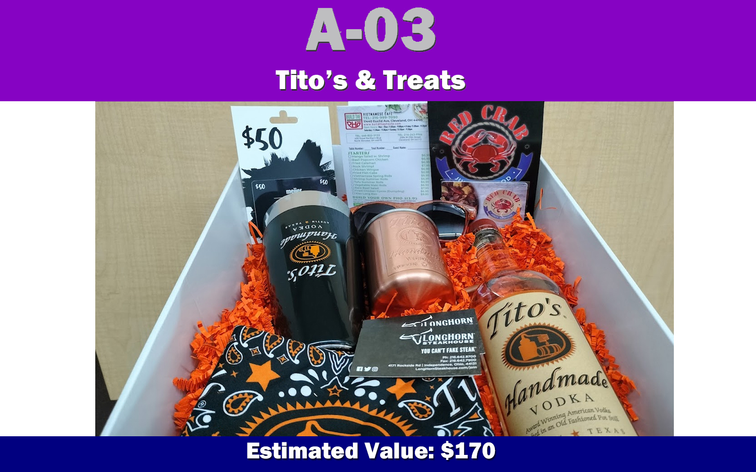 Donated by: Tito's Handmade Vodka, Red Crab Cleveland, Longhorn Rockside Road, and Build The Pho North Olmsted