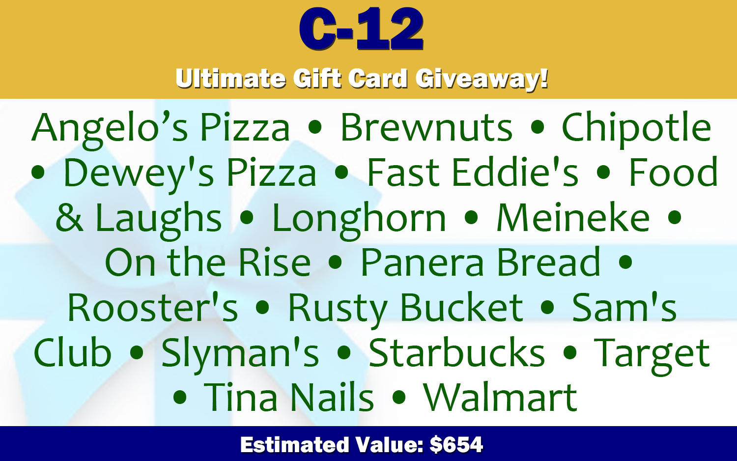 Donated by: Harbor Freight Tools, Lynn Walsh, Meijer's Fairfax Market, TJ Maxx Brooklyn, and Meineke Parma